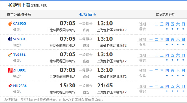 以上就是拉薩飛上海的航班時刻表,起飛時間,到達時間,及固定航班日期。